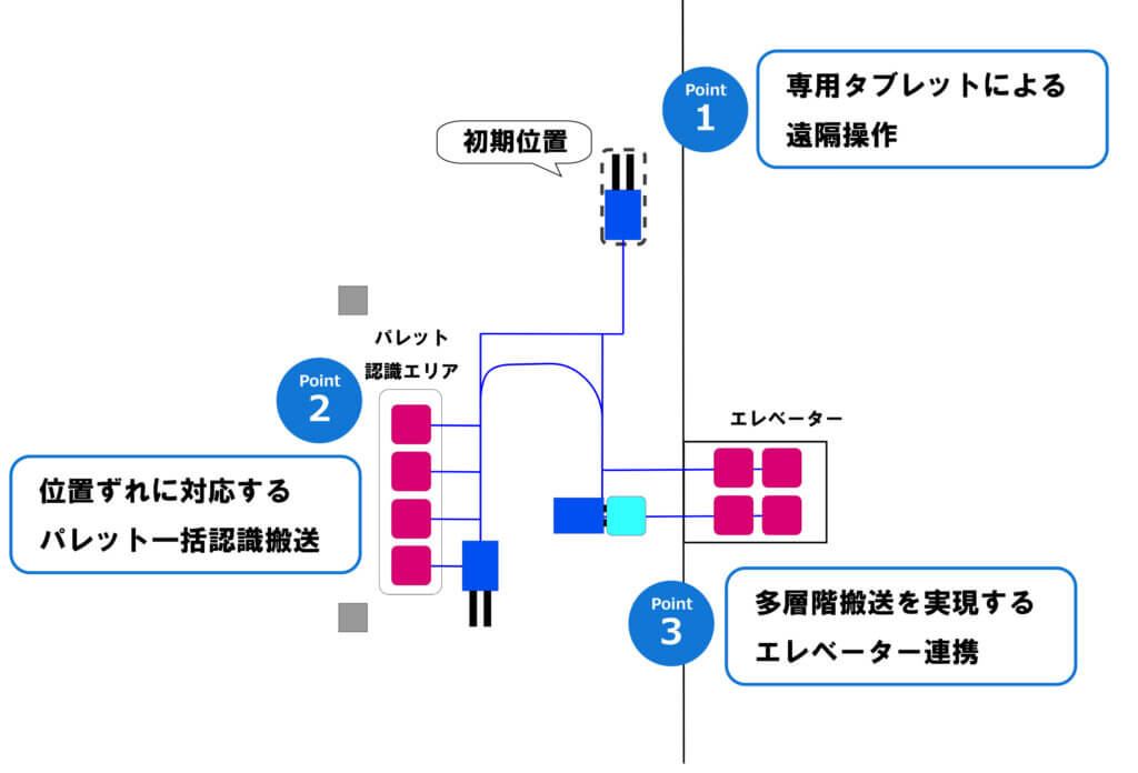 ③エレベーター前に設定されたパレット認識エリアへ移動